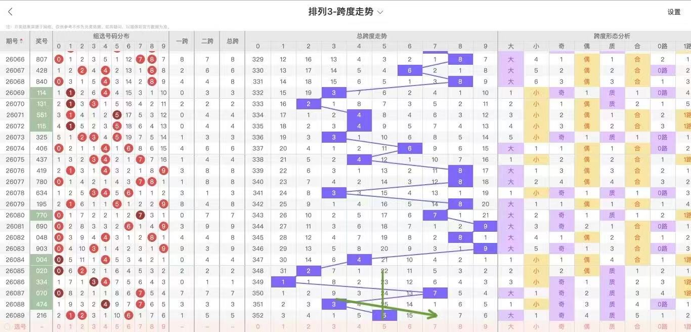 10期内跨度走势为:7-9-8-9-4-2-1-7-3-5,10期内大小跨比为6:4,奇偶跨比7:3,百期内跨度5共开出14次,下期数据:3 9 2 6 5 7 6 2 3 5 3 9 6 近期较热,考虑跨度7开出后容易出大跨度,近期大小规律小:偶:合,所以接下来继续小跨,偶跨度表现!