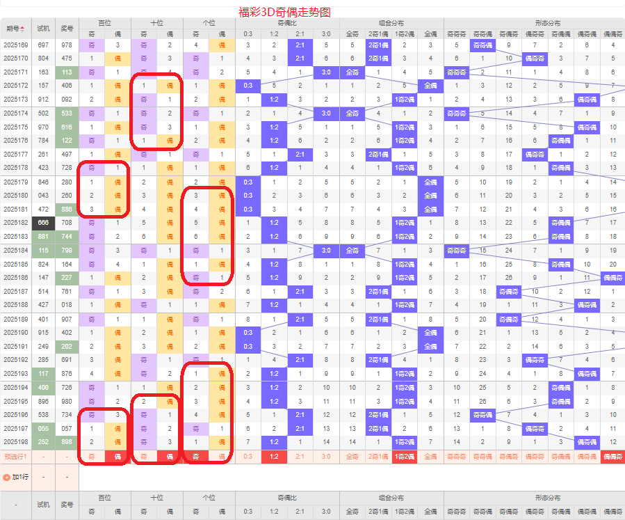 上期奇偶比是1:2,两偶的号码组合方式,从近五期的奇偶数出现情况看,奇数出现7次,偶数出现8次,奇数偶数号码出现较平均,本期侧重两偶的号码组合,侧重偶偶奇或奇奇偶的号码组合方式,根据奇偶形态做五码定位02468/02468/13579或13579/13579/02468