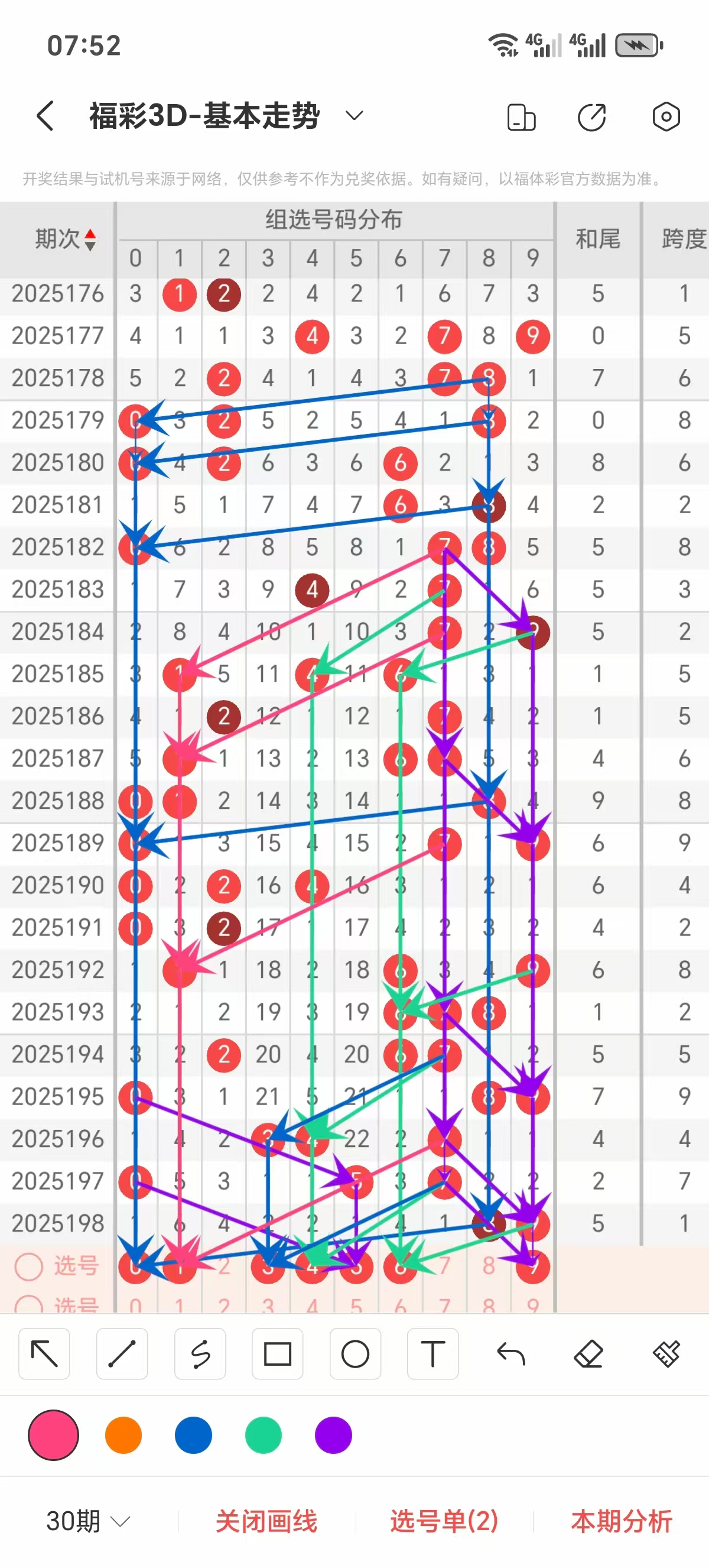 跨度通常情况下在五期之内重复一个跨度的概率很高,近五期没有重复的跨度,近五期跨度为5/9/4/7/1,近期1路的跨度较热,上期是1路的跨度,本期要侧重跨度以3/5/9跨为主的号码组合。可以从跨度方面选择相应的双胆码组合,双胆码的选取要根据近期和历史的走势进一步的分析选取。