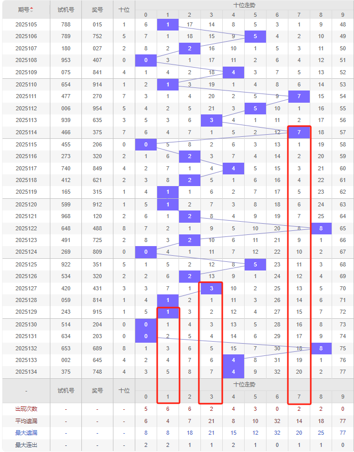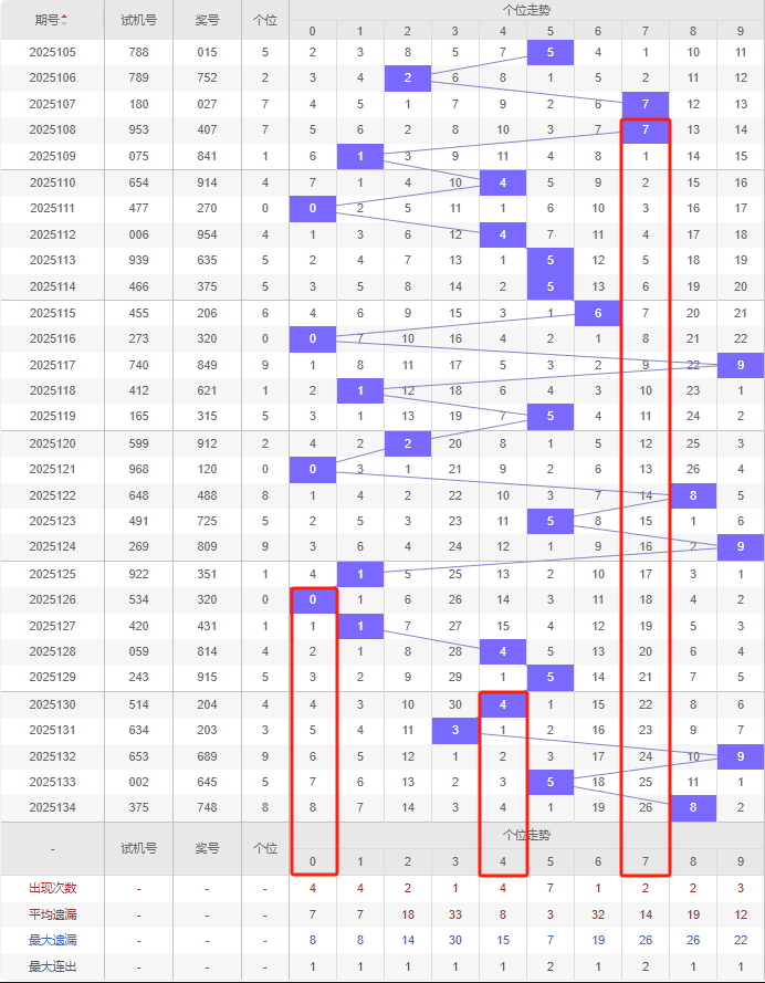 上期个位:8,近10期个位出号:1 0 1 4 5 4 3 9 5 8。最近10期大小变化分别:小小小小大小小大大大,奇偶变化分别:奇偶奇偶奇偶奇奇奇偶,质合变化分别:合质合质合质质合质合,根据近10期规律本期个位首选冷号遗漏26期的7号,次选遗漏4期的4号,防遗漏8期的0号,综上所述个位出号推荐5个号码:7 4 0 1 5。(出号概率由高排到低)。