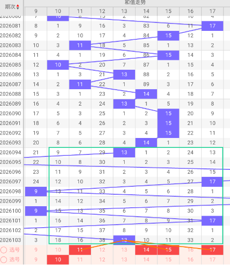 上期和值开出13,历史数据显示,和值在13之后,下一期往往会维持在中位或小幅波动。本期和值大概率会落在10-17这个区间, 因此,本期和值建议关注11、14、15、17,防10。