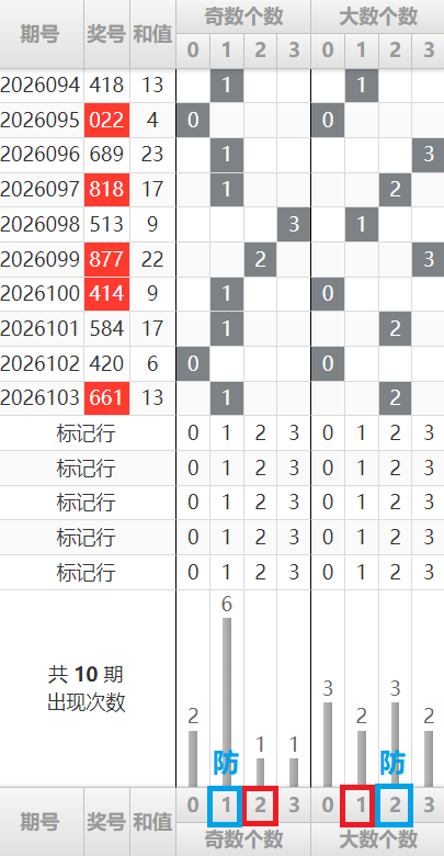 上期大小比为2:1,大数占据优势。此前小数曾连续多期强势,近期的大号回归是对小号的一种修正。考虑到和值的稳定需求,本期判断1大2小的可能性较大,防2大1小。