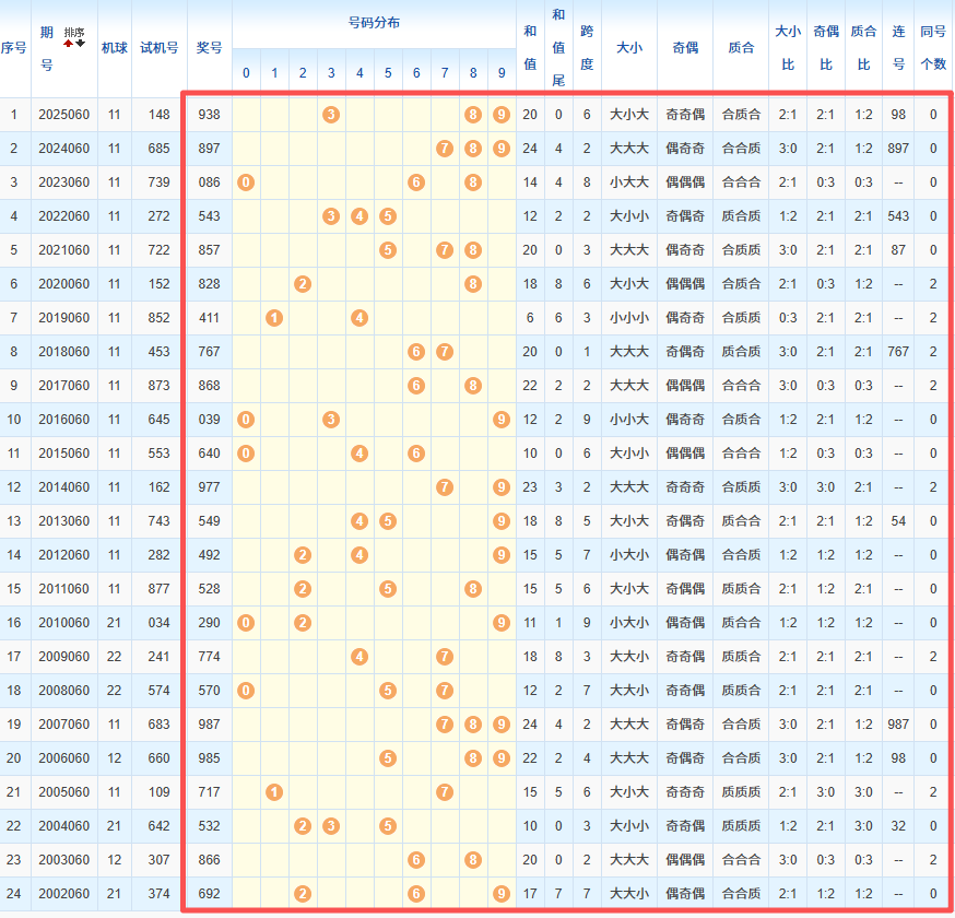 2、当十位开出9后下期开出:258972223,经统计0号出0次、1号出现0次、2号出现4次、3号出现1次、4号出现0次、5号出1次、6号出现0次、7号出现1次、8号出现1次、9号出现1次。观察发现2号出现频繁,本期可以考虑一下。