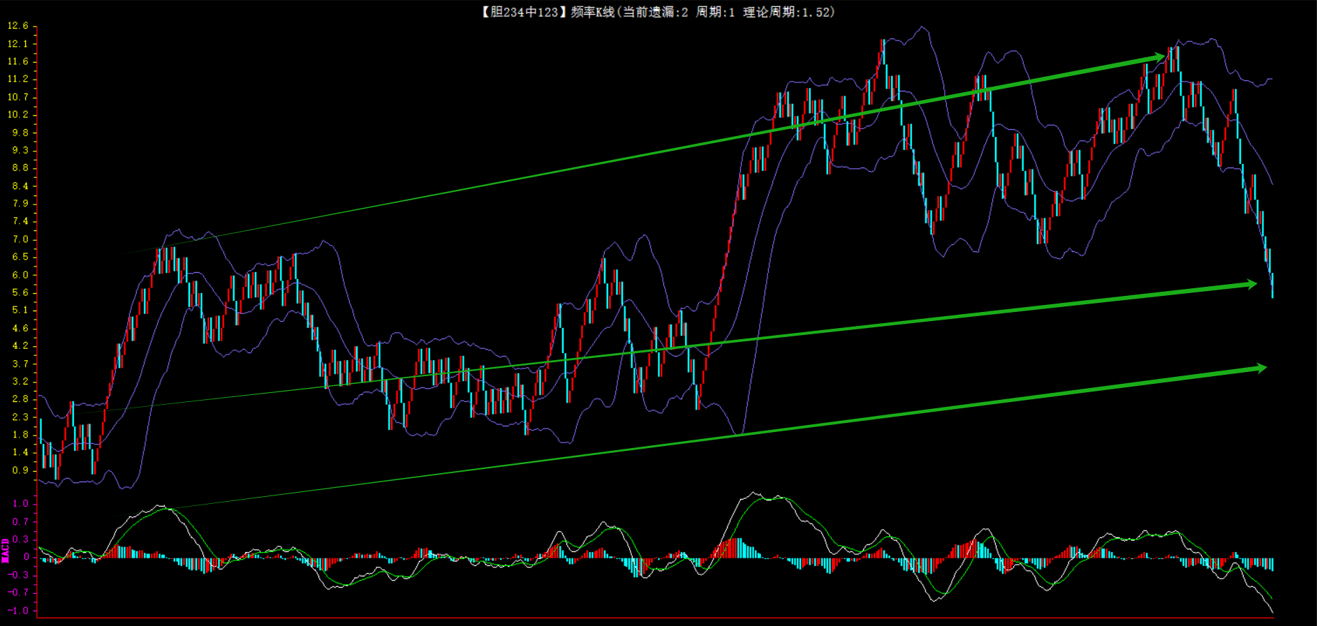 整体趋势下行,上边沿线趋势向下,下边沿趋势也是向下,节点震荡,当前开1期,本期防守。