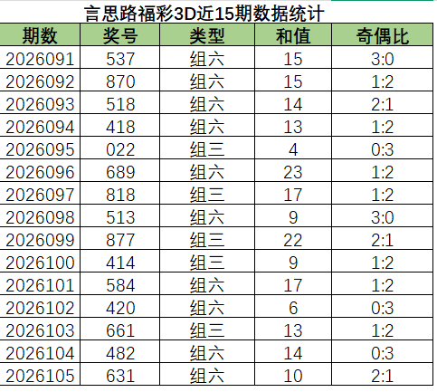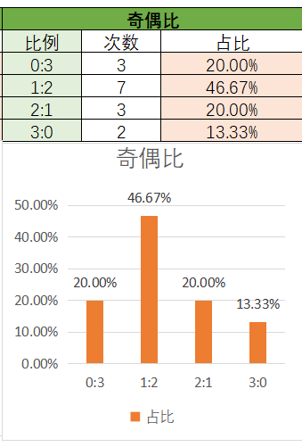 上期奇偶比为2:1,其中2:1占比变大,1:2占比变小。近15期内1:2优势最好,然后是2:10:3,最后是0:3上期开了2:1奇偶比,本期看好1:23:0奇偶比的开出,其次是2:10:3