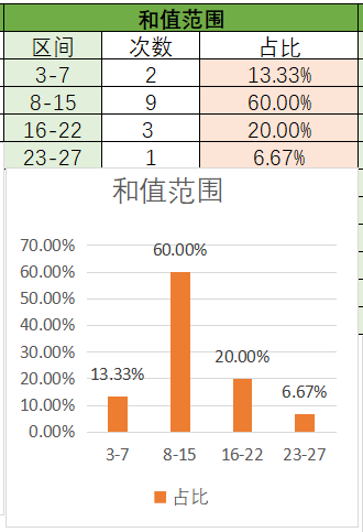 上期和值是10,各个类型占比没有变化。目前是8~15占比最优,其次是16~22,然后是3~7,最后是23~27。本期看好和值在8~15之间,其次是16~22