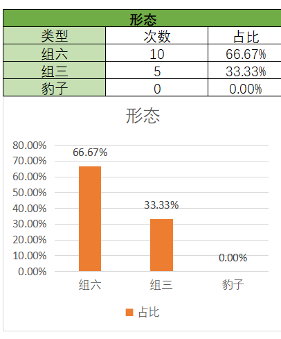上期开的是组六,各个类型占比没有变化。通过图示可以看到,组六在15期内开了10期,组三开了5期。本期关注组六,防组三