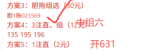 首先来看上期开奖号码为:631,和值为10,上期金胆1对,中出胆拖组选一注。
