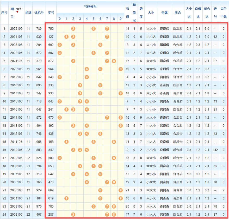 近10期开奖遗漏值分别为 7 4 4 1 5 2 1 6 1 1,奇偶属性分别为:奇偶偶奇奇偶奇偶奇奇,奇后可能开偶,而偶数遗漏值的有0125689,本期可以考虑一下。