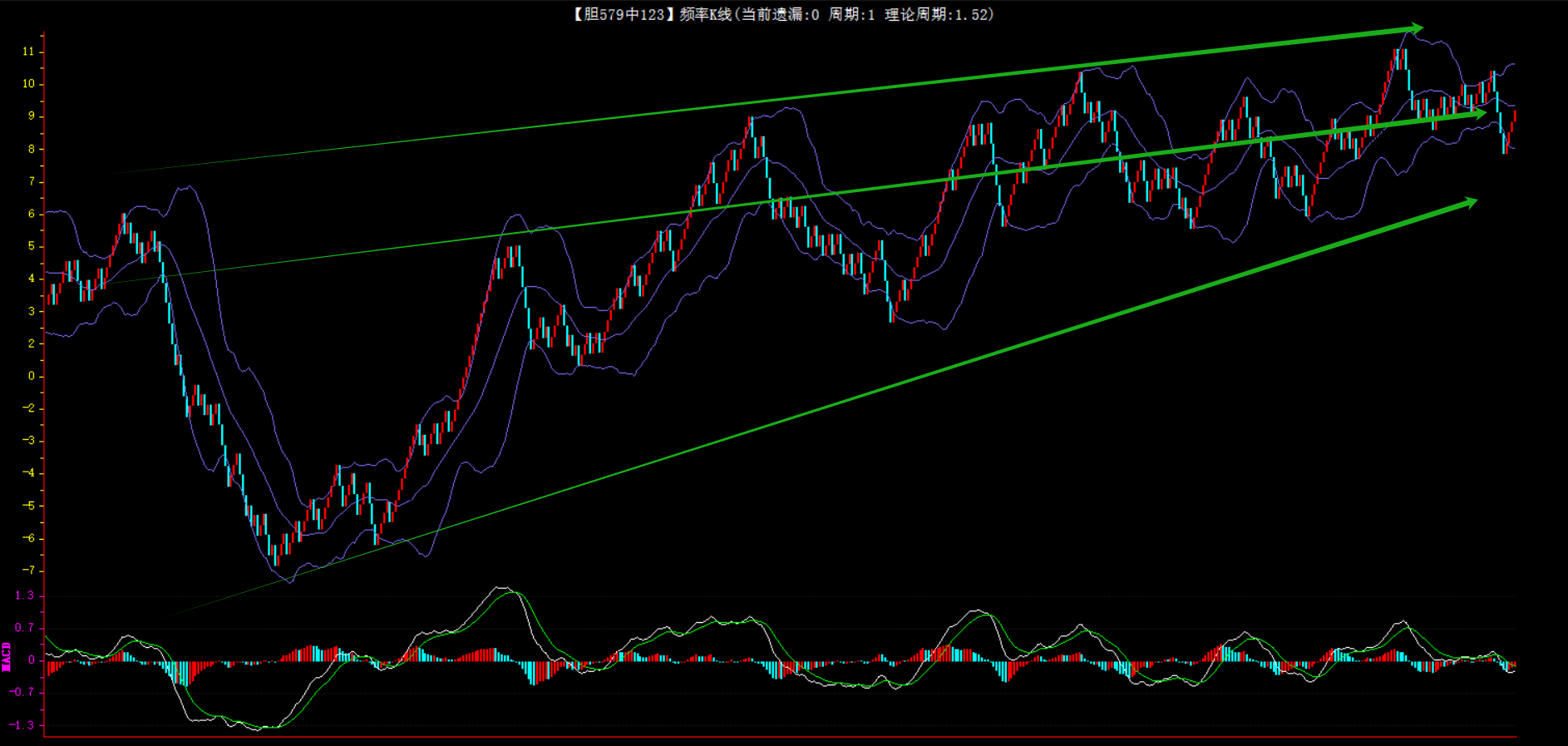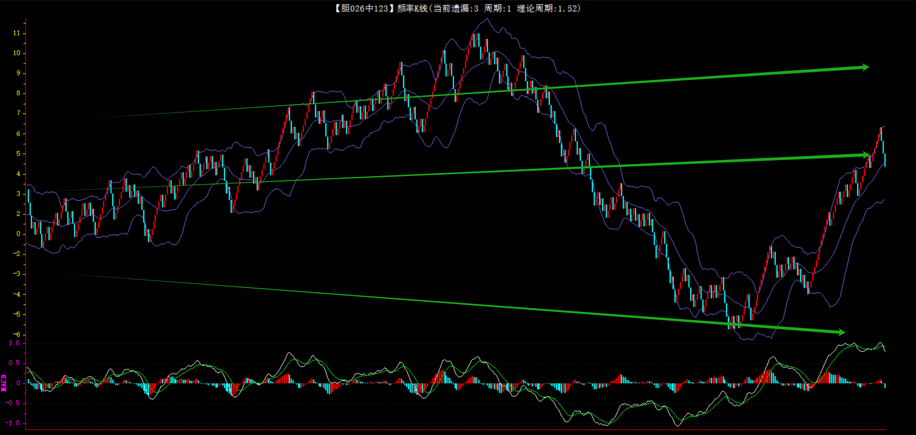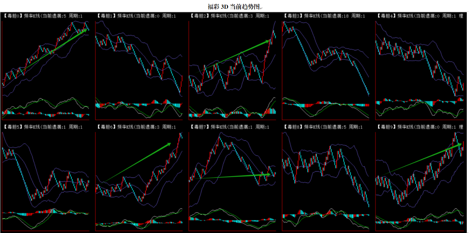 整体趋势上行,上边沿线趋势向上,下边沿趋势向下,节点震荡,当前遗漏3期,本期关注。