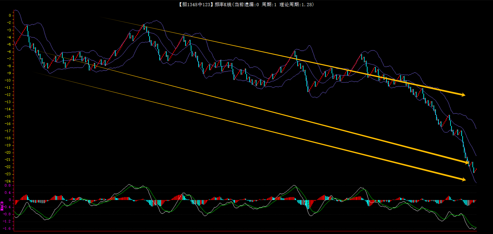 整体趋势下行,上边沿线趋势向下,下边沿趋势也是向下,节点震荡,当前连开3期,本期防守。