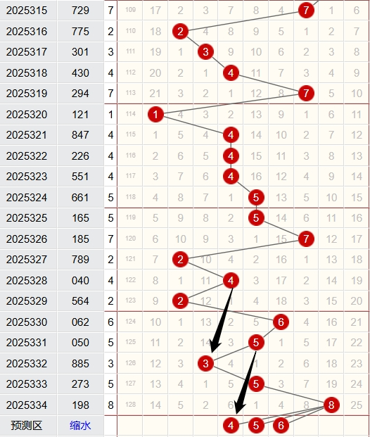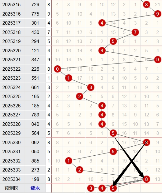 上期跨度为8,近5期跨度开出情况:第25330期开出6,属于偶数,0路号码,水属性;第25331期开出5,属于奇数,2路号码,土属性;第25332期开出3,属于奇数,0路号码,木属性;第25333期开出5,属于奇数,2路号码,土属性;第25334期开出8,属于偶数,2路号码,木属性;