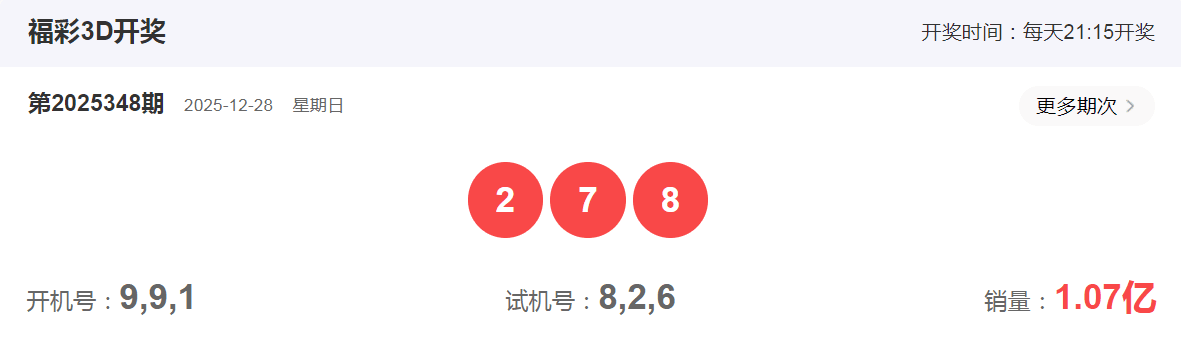 福彩3D2025年12月28日第348期开奖号码是278,组六形态,和值17,跨度6,偶奇偶,小大大