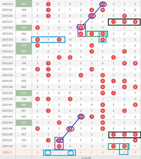 今天咱们利用小盘的走势图来往下分析,因为大盘走势经常会变换位置,或者变换对应数,让咱们防不胜防,所以咱们换一种思路,用小盘来分析,小盘只能得出组选号码,回到正题,第一次开出了黑颜色框789,蓝颜色线条从上到下分别是6隔空5,再隔空4,形成了654的顺子等距,蓝颜色线条是由大到小的排列方式,第二次黑颜色框也开出了789,第二次蓝颜色线条从上到下分别是4隔空3,再隔空2,形成了432的顺子等距,第二次蓝颜色线条也是由大到小的排列方式,第一次紫颜色框是落号,第二次紫颜色框也是直接落号,第一次绿颜色框开出了5和6,第二次绿颜色开出了7和8,形成了5678的顺子,那么轮到今天,第一次青颜色落号,第二次会不会落号8,第一次青颜色开出0和2,和02能组成的顺子只有1和3,或者4和6,形成0123的顺子,或者0246的全偶顺子,文字表达可能不太清楚,大家可以观看上面的视频
