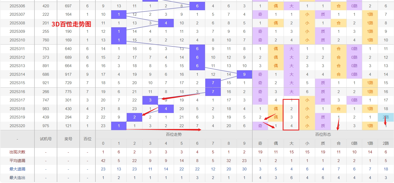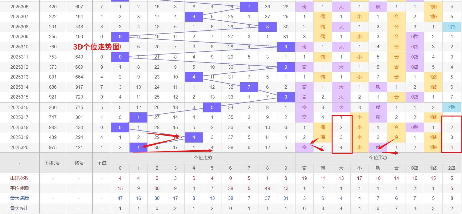 福彩3D个位分析:第2025320期个位开出号码1属于小奇数前端,从以上个位走势图中可以看出近100期的大小比约为47:53奇偶比约为52:48大小奇偶数据上有点差异有需求但不是太明显,不太好看这时就要借助连线走势和遗漏数据来帮助我们缩水号码。上期个位落号“1”小奇数1路号码球,号码开出了3振幅,连续多期的大振必被小振幅取代幅符合我们的预期,那么本期我们在个位考虑振幅走势走前依然要转变思路考虑大振幅,具体考虑(1-5)个振幅是我们主要的方向,那么在对个位落号情况进行系统的分析时我们可以明显的看到个位号码走势呈现大范围震荡,尤其是在号码的落位特点上表现的尤为突出,那么本期我们在个位分析时就要注意号码的风险,避免出现踏空。近期3D个位走势来看,号码2和6已分别遗漏30期和38期,明显进入冷态阶段,这种长期遗漏往往预示着回补动能在不断累积;根据概率均衡理论,冷号在经历较长的沉寂周期后,通常会有较强的反弹需求,尤其当遗漏值达到一定程度时,其解冻回升的可能性会显著增加,因此接下来需要重点关注2和6可能出现的回补信号。与此同时,号码7作为近期热号表现相当活跃,形成连续开出的强势格局,但热号往往存在"物极必反"的转换规律,在关注其持续热出的同时,也要警惕热号突然转冷的风险,因此福彩3D第2025321期个位看好23678。