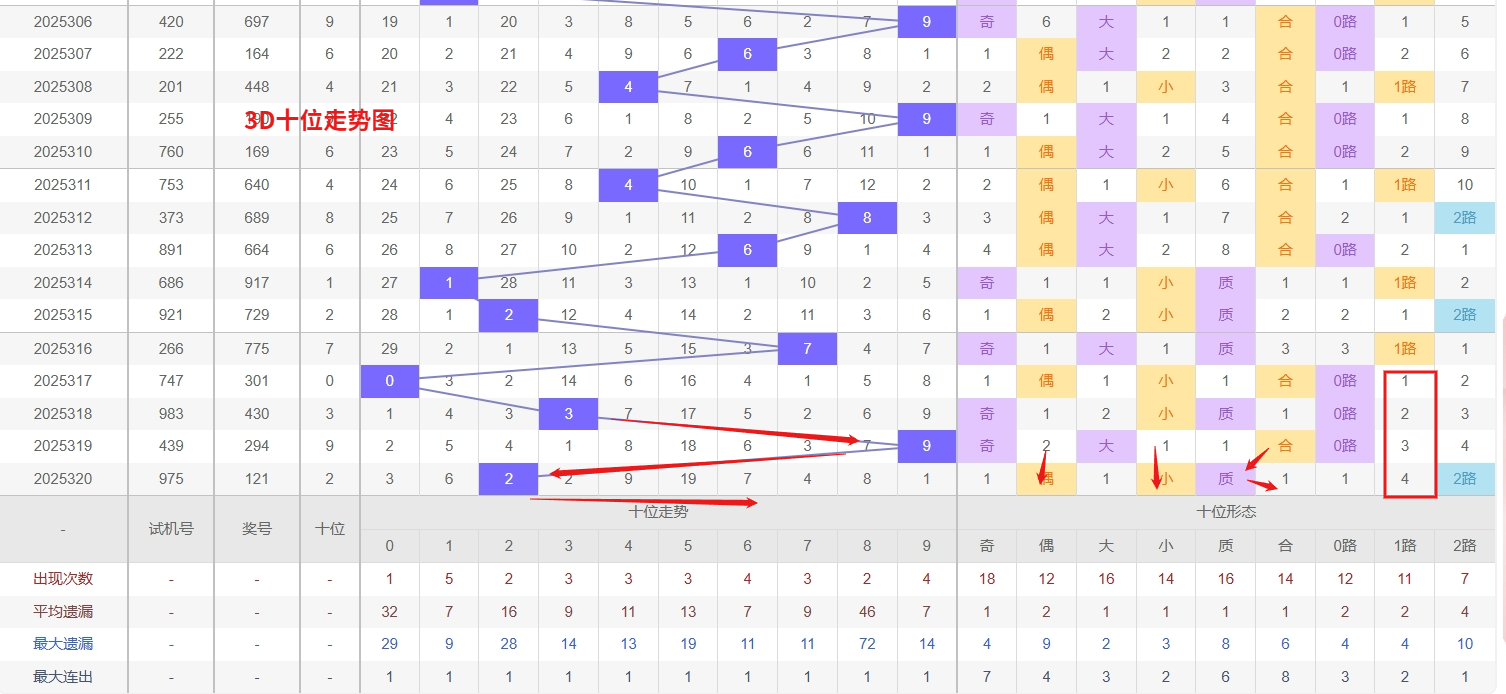 福彩3D十位分析:第2025320期十位开出号码2属小偶数号码前端。以历史100期数据为例十位奇偶比约为47比53,大小比约为55比45近期大小相差7点,根据求均衡的规律开出小数的概率比大数高一点。上期我们分析奇数经过连续回补后有走偶数的可能,开出奖号2小偶数符合我们的预期。近期3D十位走势观察,号码0和8已进入明显的冷态周期,遗漏值持续扩大,冷号在经历长期沉寂后往往具备较强的反弹动能,尤其当走势出现格局调整时,这类冷号更容易迎来转机,密切跟踪其解冻信号。与此同时,号码1作为近期热号表现异常活跃,形成连续开出的强势趋势,但需注意热号通常存在"盛极而衰"的转换节点,在跟进热号的同时务必保持警惕,防范其突然转冷的风险。采用"冷热均衡"的投注策略,既可关注0和8的回补机会适当布局,同时对热号1设置合理防区,所以福彩3D第2025321期十位推荐01258。