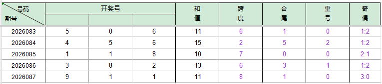 2026083期开奖号码506,我们可以看出近30期百位5出现4次,十位0出现6次,个位6出现3次。