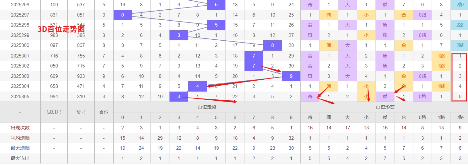 福彩3D百位分析:第2025305期百位开出号码3属于小奇数,从上面百位走势图上可以看出近100期大小比约为46:54奇偶比约为48:52。近期数据还是比较极端的符合文章开头介绍的求均衡规律非等量现象。但这种均衡不会持续最终会被偏态运行打破,然后循环往复。但短期内大小相差1点,大数过热小数有回补需求本期个人认为走小数的概率更高。上期百位落号“3”号球,在百位号码开出0路号码3后向小数方向走出1个振幅。那么通过分析上期百位落位号码分析,号码走出1个振幅,号码走为小奇数,开出0路号码3。通过对百位落号趋势来分析,百位号码落位前端,通过对近10期的走势来看百位号码大小交替频繁走3期大数又走2小数,近期3D百位走势分析来看,号码8表现持续强势,形成了明确的热出态势,根据“热者恒热”的走势规律,在未出现明显转冷信号前,重点防范其继续惯性开出;与此同时,号码9已进入明显的冷态区间,其当前遗漏值远超理论出现周期,按照概率均衡的“冷极必补”原则,该号码的回补动能正在不断累积,尤其在与热号8形成相邻对比的情况下,更凸显其反弹的迫切性;采取“追热防冷”的双轨思路,既要关注热号8的持续表现,也要警惕冷号9随时可能出现的强势回归,我们在百位关注的重点在05689这5个号码球上,百位号码近期奇偶切换频繁,3号球码属于0路号码奇数,现奇数开出过多有向偶的趋势。所以福彩3D第2025306期百位看好05689。