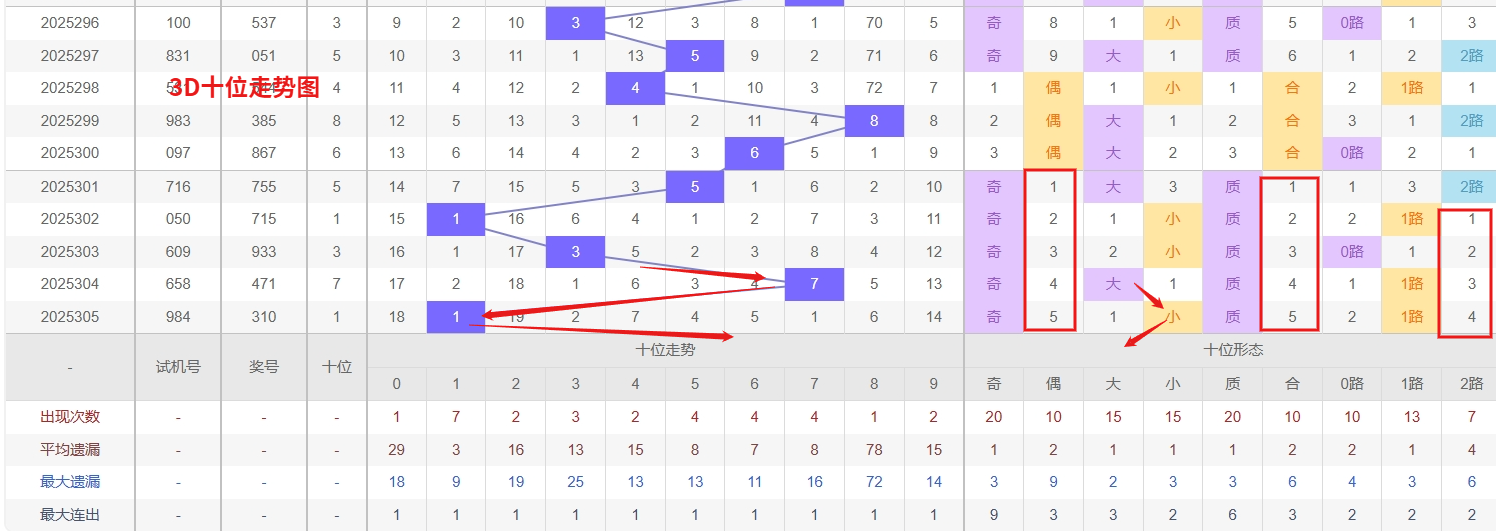 福彩3D十位分析:第2025305期十位开出号码1属小奇数号码前端。以历史100期数据为例十位奇偶比约为46比54,大小比约为55比45近期大小相差6点,根据求均衡的规律开出小数的概率比大数高一点。上期我们分析偶数经过连续回补后有走奇数的可能,开出奖号1小奇数符合我们的预期。近期3D十位走势分析来看,号码6表现异常强势,已形成典型的热出态势,根据“趋势跟踪”原理,在热门号码未出现明显转冷信号前,须重点防范其连续开出的可能性,这种强势形态往往具备惯性延伸的动力;与此同时,号码8已陷入深度冷态,其当前遗漏值远超理论出现周期,按照“冷极必补”的均衡法则,该号码的回补动能正持续累积,任何一次开出都可能引发冷态指标的强势修复;采取“顺势防冷”的双重布局,既要跟进热号6可能形成的连庄趋势,也要警惕冷号8随时可能出现的绝地反弹,所以福彩3D第2025306期十位推荐23689。