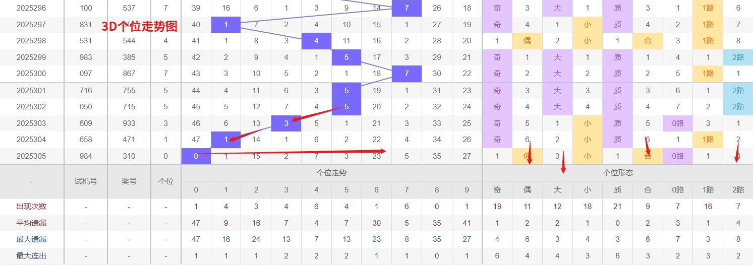 福彩3D个位分析:第2025305期个位开出号码0属于小偶数前端,从以上个位走势图中可以看出近100期的大小比约为51:49奇偶比约为53:47大小奇偶数据上有点差异有需求但不是太明显,不太好看这时就要借助连线走势和遗漏数据来帮助我们缩水号码。上期个位落号“0”小偶数0路号码球,号码开出了1振幅,连续多期的大振必被小振幅取代幅符合我们的预期,那么本期我们在个位考虑振幅走势走前依然要转变思路考虑大振幅,具体考虑(1-6)个振幅是我们主要的方向,那么在对个位落号情况进行系统的分析时我们可以明显的看到个位号码走势呈现大范围震荡,尤其是在号码的落位特点上表现的尤为突出,那么本期我们在个位分析时就要注意号码的风险,避免出现踏空。近期3D个位走势分析来看,号码7表现持续强势,已形成明确的热出态势,根据“热者恒热”的走势规律,在未出现明显转冷信号前,重点防范其继续惯性开出;与此同时,号码6和8已双双进入深度冷态,两者的遗漏值均远超理论出现周期,按照概率均衡的“冷极必补”原则,这对相邻冷号的回补动能正在不断累积,尤其值得注意的是,冷号6和8同时处于低温状态,这种对称性冷态往往预示着更强的技术性反弹需求;既要顺势关注热号7的持续表现,更要严密防范冷号6和8可能出现的联手回补,因此福彩3D第2025306期个位看好35678。