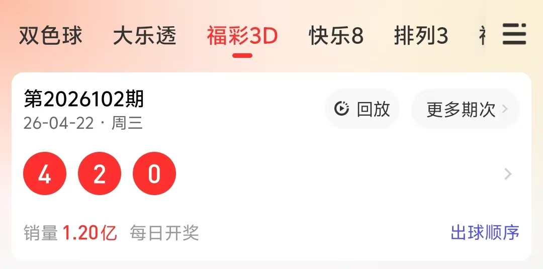福彩3D第102期(2026年4月22日晚21:15开奖)中奖号码为:4 2 0(组六形态)