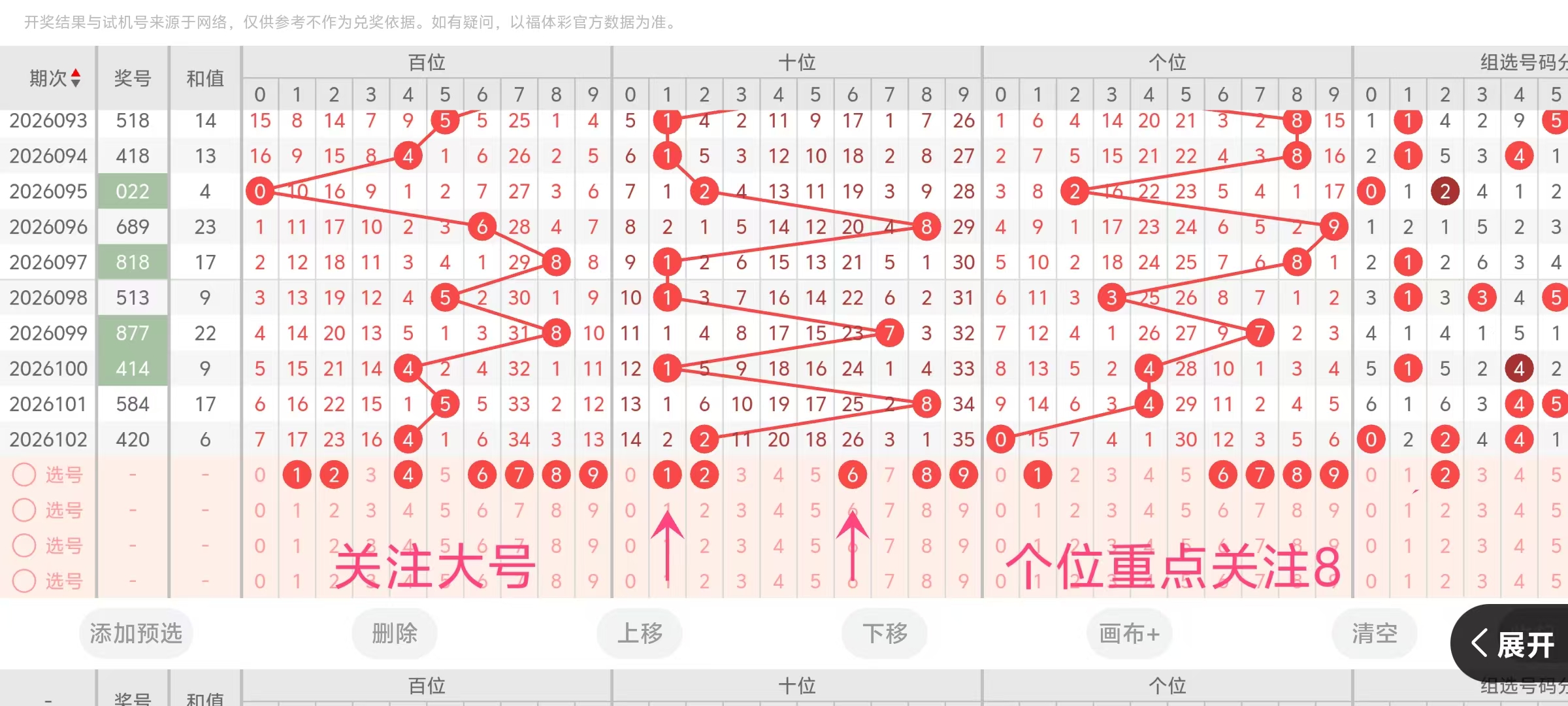 特别提示: 跨度4在近期走势中持续活跃,第100期(414)跨度为3,第101期(548)跨度为4,第102期(420)跨度再次开出4,跨度4连续两期出现,这种连续出现后下一期往往伴随跨度回调,是103期的重要参考信号,跨度4在福彩3D历史开奖中属于常见跨度,约占总体开奖比例的15%左右,其连续出现后一般会转向跨度2、3,7或8