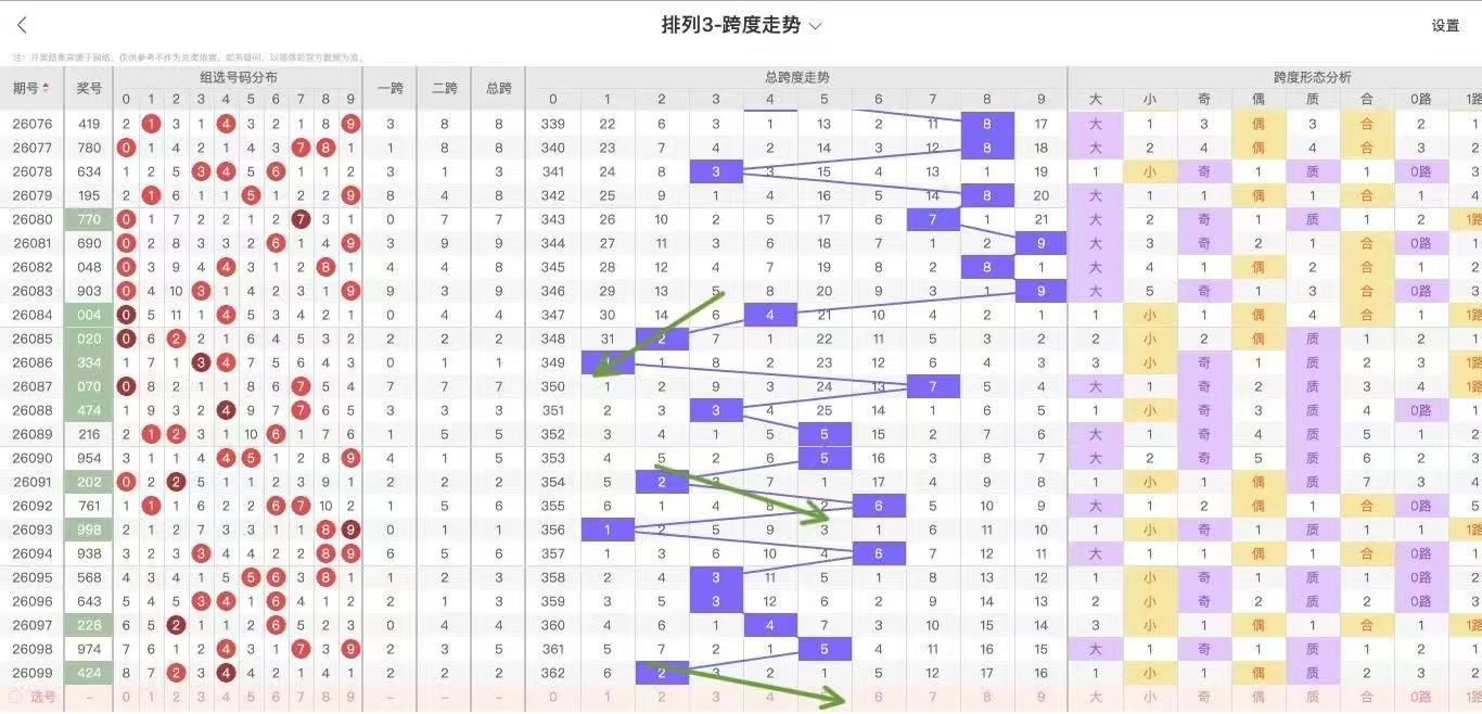 10期内跨度走势为:5-2-6-1-6-3-3-4-2,-210期内大小跨比为4:6,奇偶跨比6:4,百期内跨度2共开出8次,下期数据:4 7 6 5 4 1 6近期较热,考虑跨度2开出后容易出大跨度,近期大小规律大:奇:质,所以接下来继续大跨,奇跨度表现!