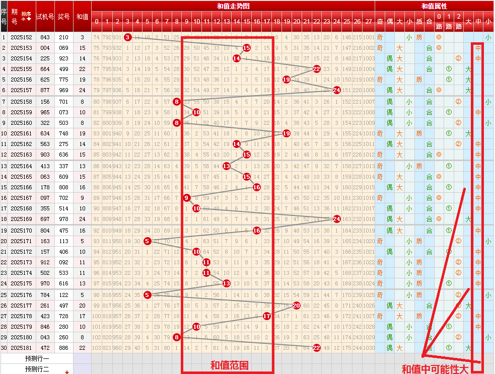 从上图可以开出,按和值大(18-27)中(9-17)小(0-8)分区,上期开出和值大,按近期趋势和跟随表现,本期和值中可能性大,和值大致在9-17间。
