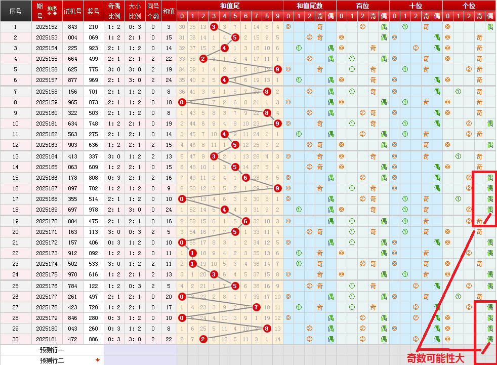 近30期和值奇共开出14期,和值偶共开出16期,和值奇稍微弱势。近五期分别开出2奇1奇0奇0奇0奇,奇数非常弱势。观察各位置奇偶分布情况,上期开出和值偶,本期和值奇偶都有可能。