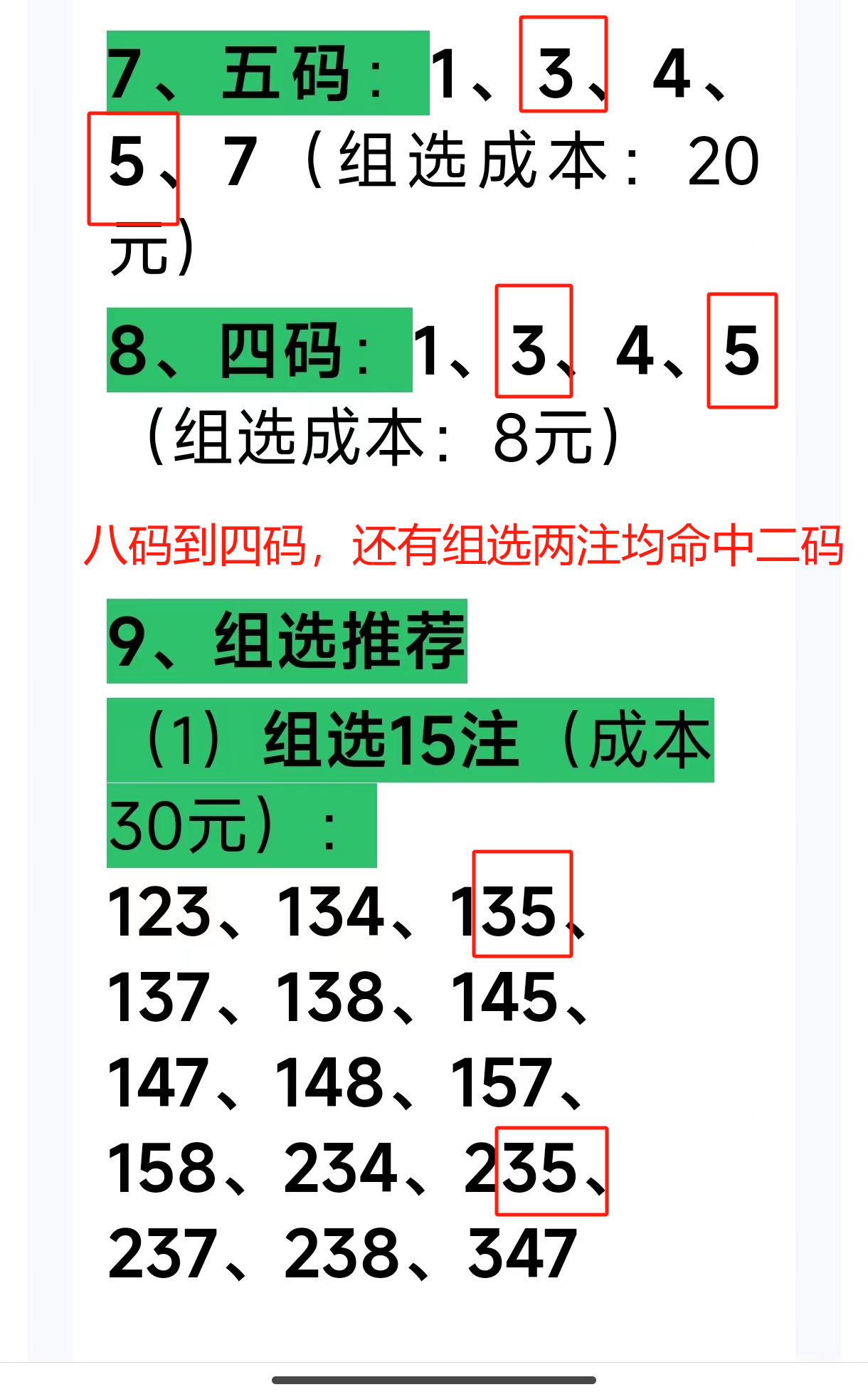 此外,和值尾8和跨度5双双命中,八码至四码和组选15注中的两注(135和235)也精确锁定二码——3和5。