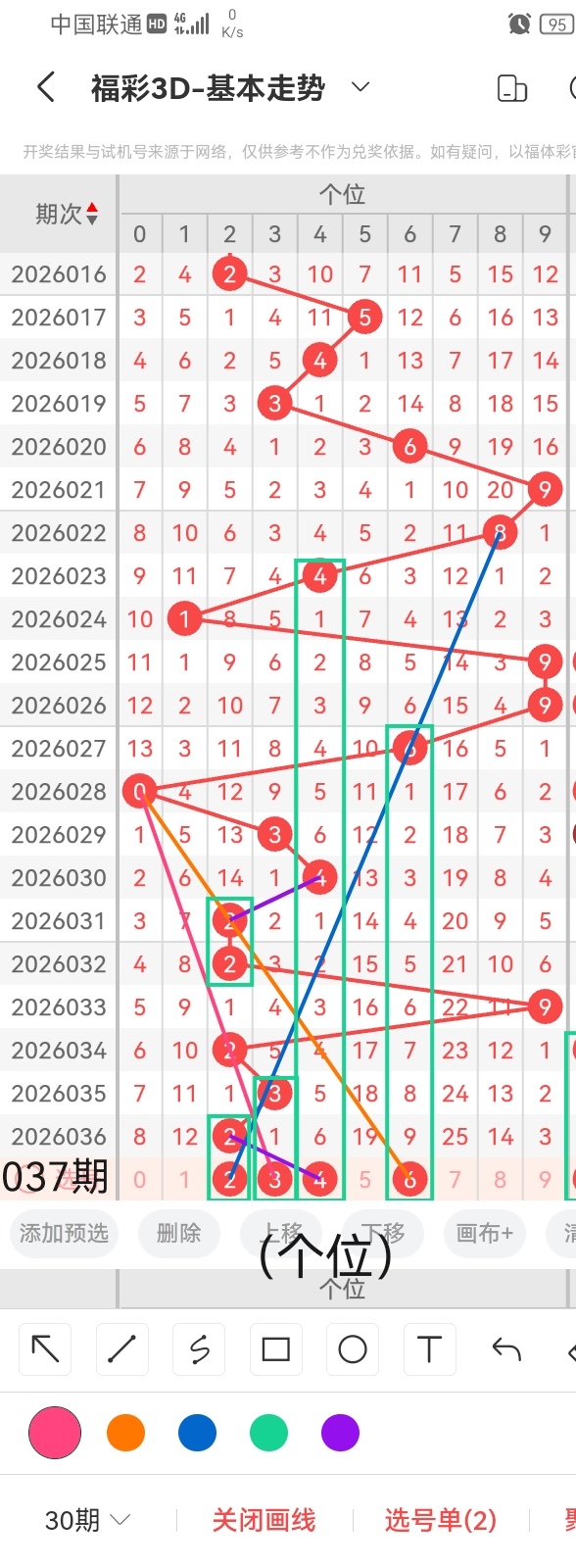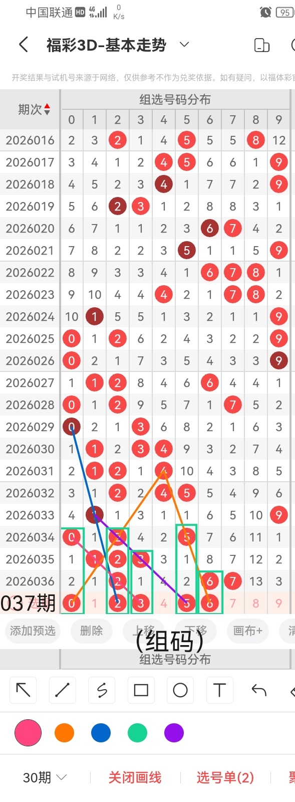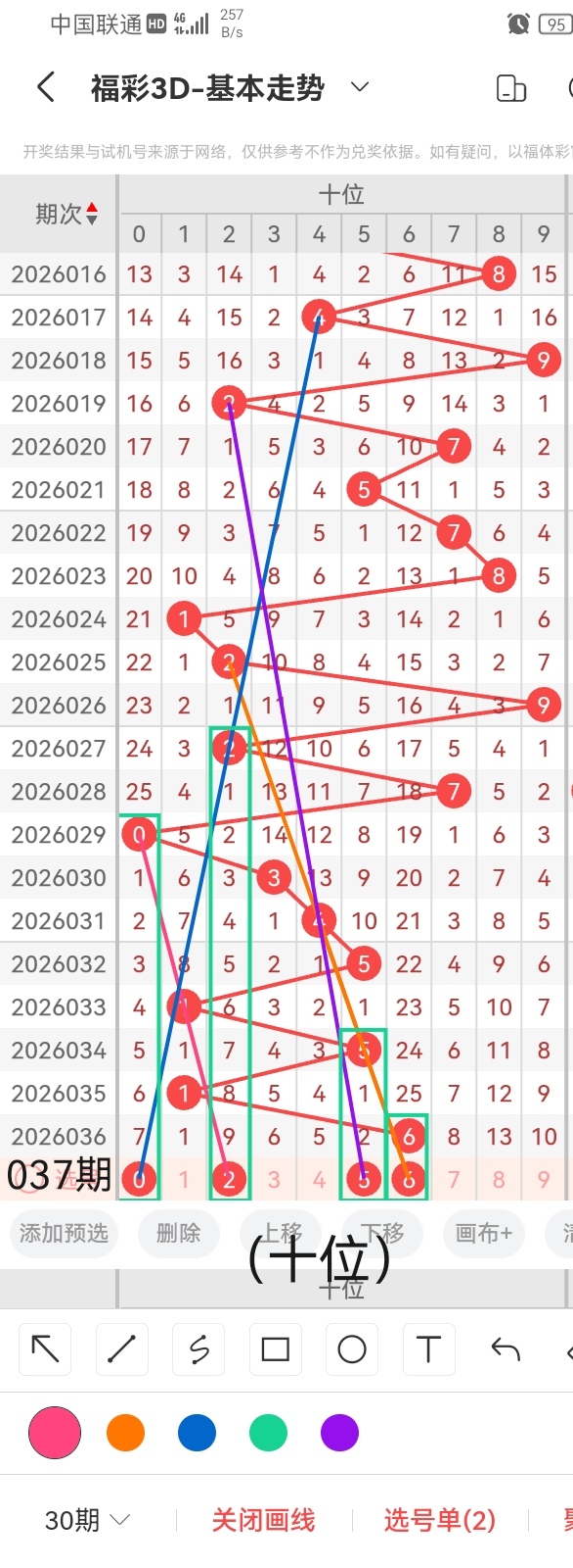 小梁根据上图中的画线思路可以看出,号码0与前几期开出的号码呈斜三连的走位且呈隔两期回补的走势;号码2与前几期开出的号码呈斜三连的走势且呈直四连回补的走位;号码3与前几期开出的号码呈斜四连的走位且呈隔期回补的走势;号码5与前几期开出的号码呈隔两期回补的走势且呈斜四连的走位;号码6与前几期开出的号码呈斜三连的走位且呈直连回补的走势。