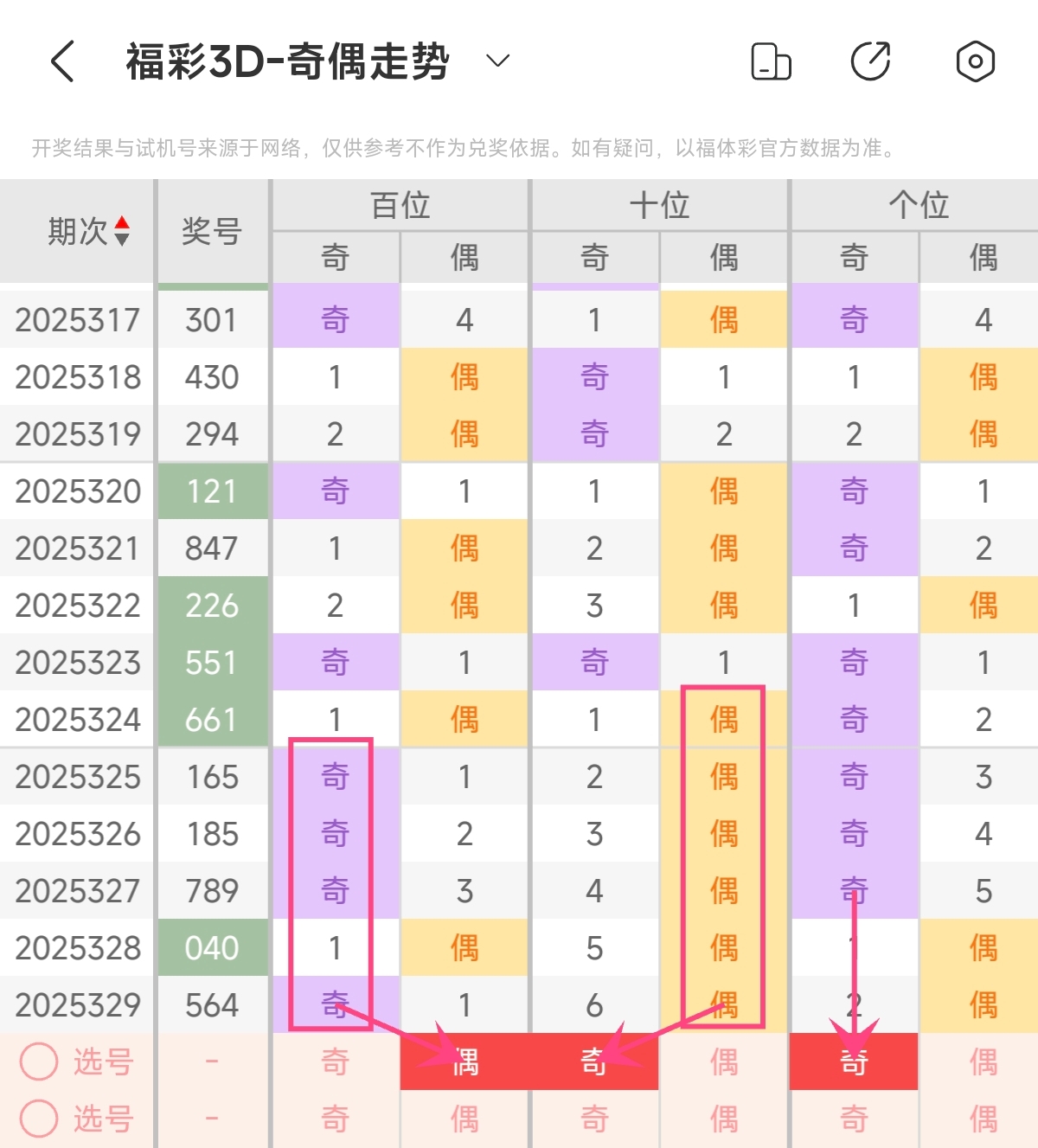 预计本期可关注奇偶比2:1,奇数占优组合 。本期奇偶形态可重点关注:偶奇奇。