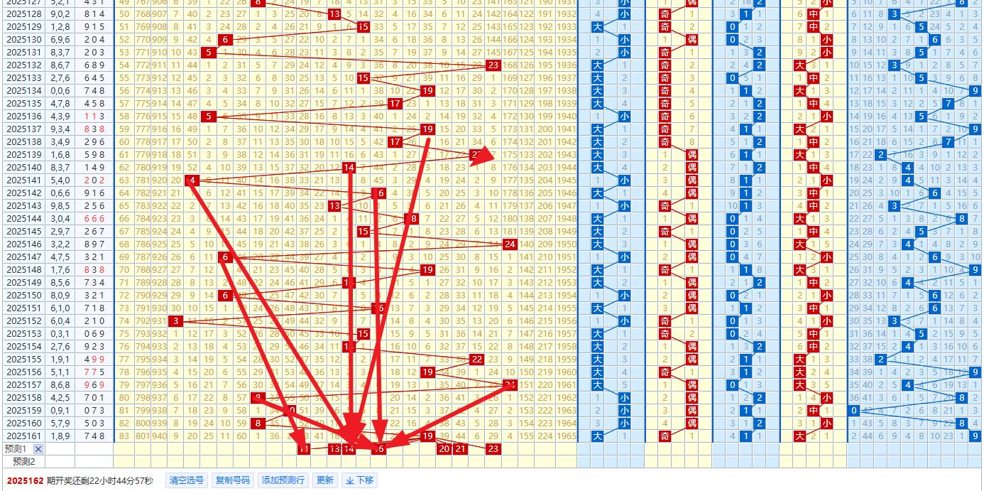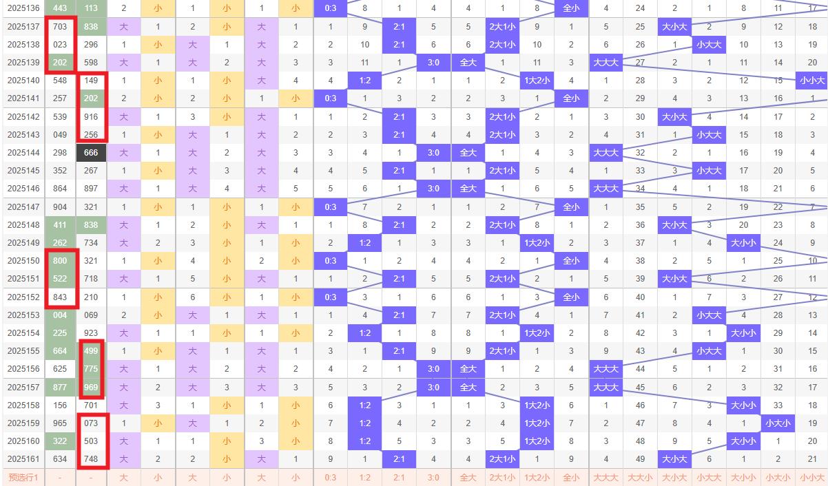 两小一大组合出现4次,两大一小组合出现3次,全大组合出现2次,全小组合出现1次,本期预计开出两小一大组合;本期形态看号组六;组三遗漏4期。