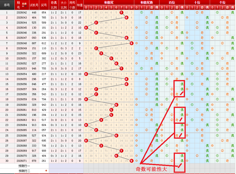 观察各位置奇偶开出趋势,本期选择奇数1-2个。