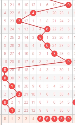 上图是福彩3D开奖号码走势图,我在上面走势图中标注出来的数字当成一个区域,这个区域数字是23456789,一共有8个数字,这8个数字组成的跨度二组合连续9期没出现上次是连续6期没出现,这个区域的跨度二组合有24 35 46 57 68 79一共有6组,那么本期可以关注关注这个区域出跨度二组合。