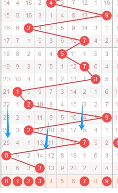 上图是福彩3D开奖号码走势图中十位走势图,我在上面标注出来的数字是我觉得可以关注的,因为最近几期开出的遗漏周期都大,上期开出数字3的遗漏周期是14期,上上期开出的遗漏周期是25期,连续两期开出的遗漏周期都大,那么本期关注那几个遗漏周期小的数字,关注数字012379,个人最看好这3个数字129。
