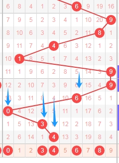 上图是福彩3D开奖号码走势图中个位走势图,我在上面标注出来的数字是我觉得可以关注的,因为最近几期开出的遗漏周期大,上期开出数字4遗漏周期是6期,上上期开出数字3遗漏周期是9期,那么本期关注遗漏周期小的数字03468,个人最看好数字3468。