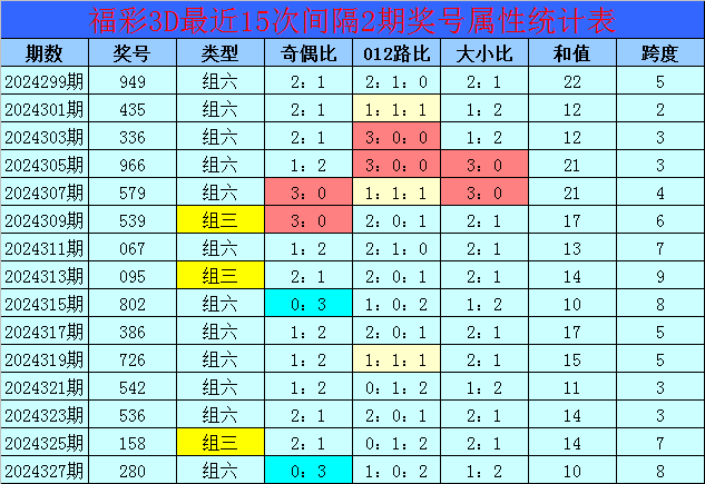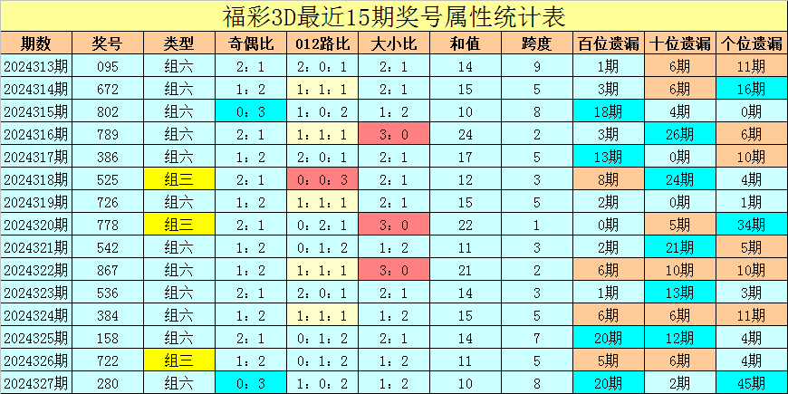 福彩3D第2024327期奖号为280,奖号组选类型为:组六,012路比为1:0:2,奇偶比为0:3,大小比为1:2,和值开出10,跨度开出8。