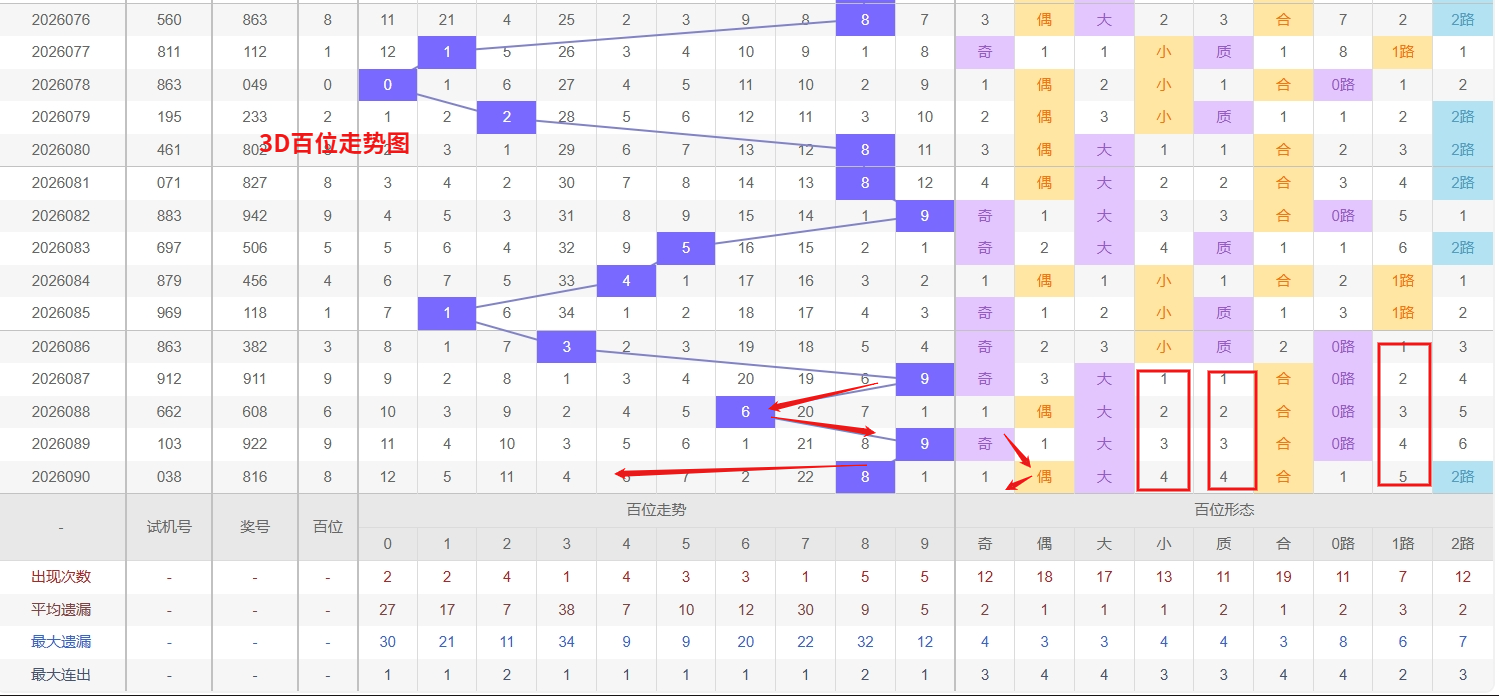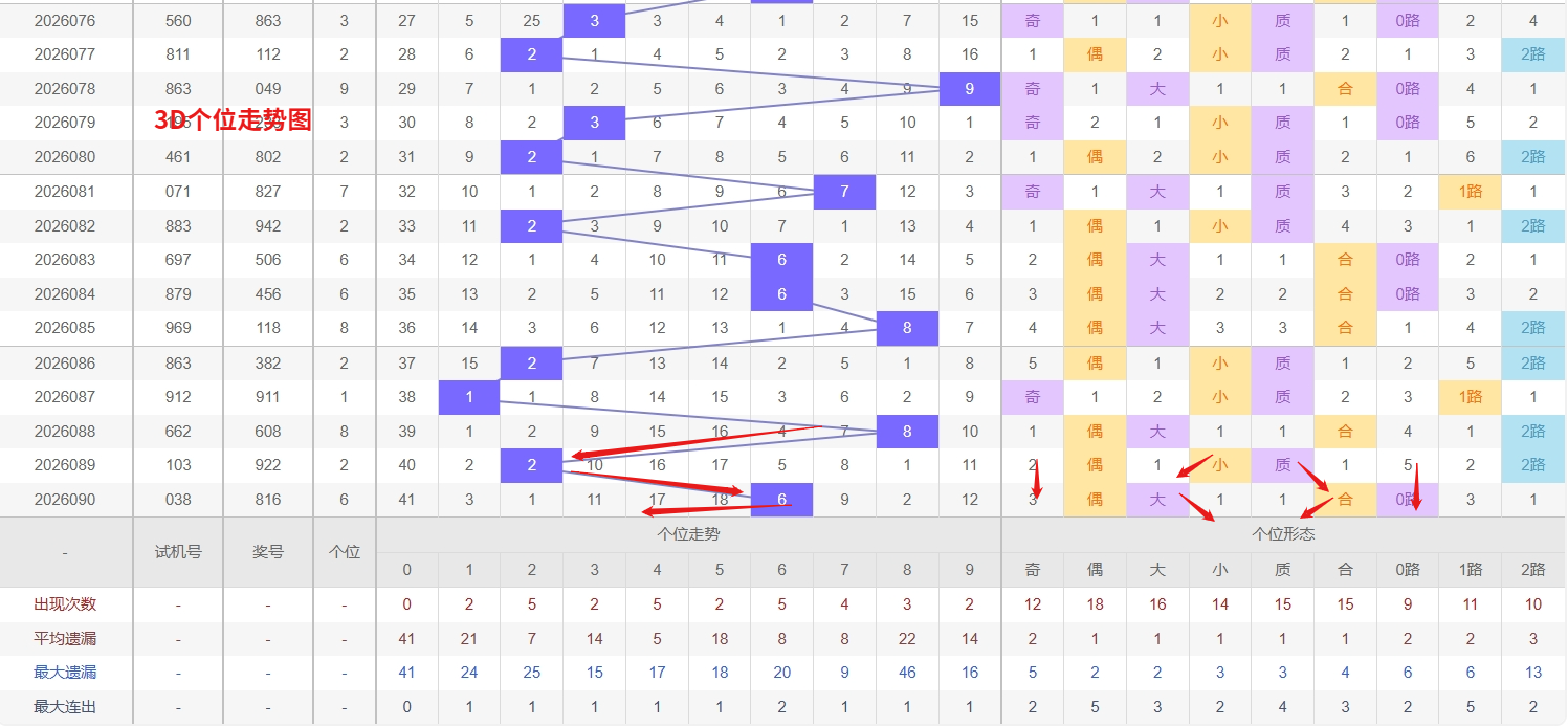 福彩3D个位分析:第2026090期个位开出号码6于大偶数中端,从以上个位走势图中可以看出近100期的大小比约为53:47奇偶比约为52:48大小奇偶数据上有点差异有需求但不是太明显,不太好看这时就要借助连线走势和遗漏数据来帮助我们缩水号码。上期个位落号“6”大偶数0路号码球,号码开出了4振幅,连续多期的大振必被小振幅取代幅符合我们的预期,那么本期我们在个位考虑振幅走势走前依然要转变思路考虑大振幅,具体考虑(1-5)个振幅是我们主要的方向,那么在对个位落号情况进行系统的分析时我们可以明显的看到个位号码走势呈现大范围震荡,尤其是在号码的落位特点上表现的尤为突出,那么本期我们在个位分析时就要注意号码的风险,避免出现踏空。近期3D个位走势中,0作为明显的冷号已经遗漏多期未出,冷态积累较为充分,从历史出号规律来看,极端遗漏往往伴随着较强的回补需求,随着其他中段数字的反复开出,0的补位概率正在逐步提升,接下来需重点防范其随时反弹,可作为防守或博冷策略的核心选项。与此同时,4则展现出典型的热号特征,近期开出频率明显偏高,连出或隔期重现的形态较为常见,属于持续走热的态势,虽然热号有惯性延续的可能,但也要警惕其由热转温的节奏变化,因此福彩3D第2026091期个位看好01248。