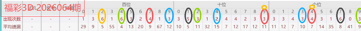 福彩3D2026064期分析分享(上期中6,7码及定位)