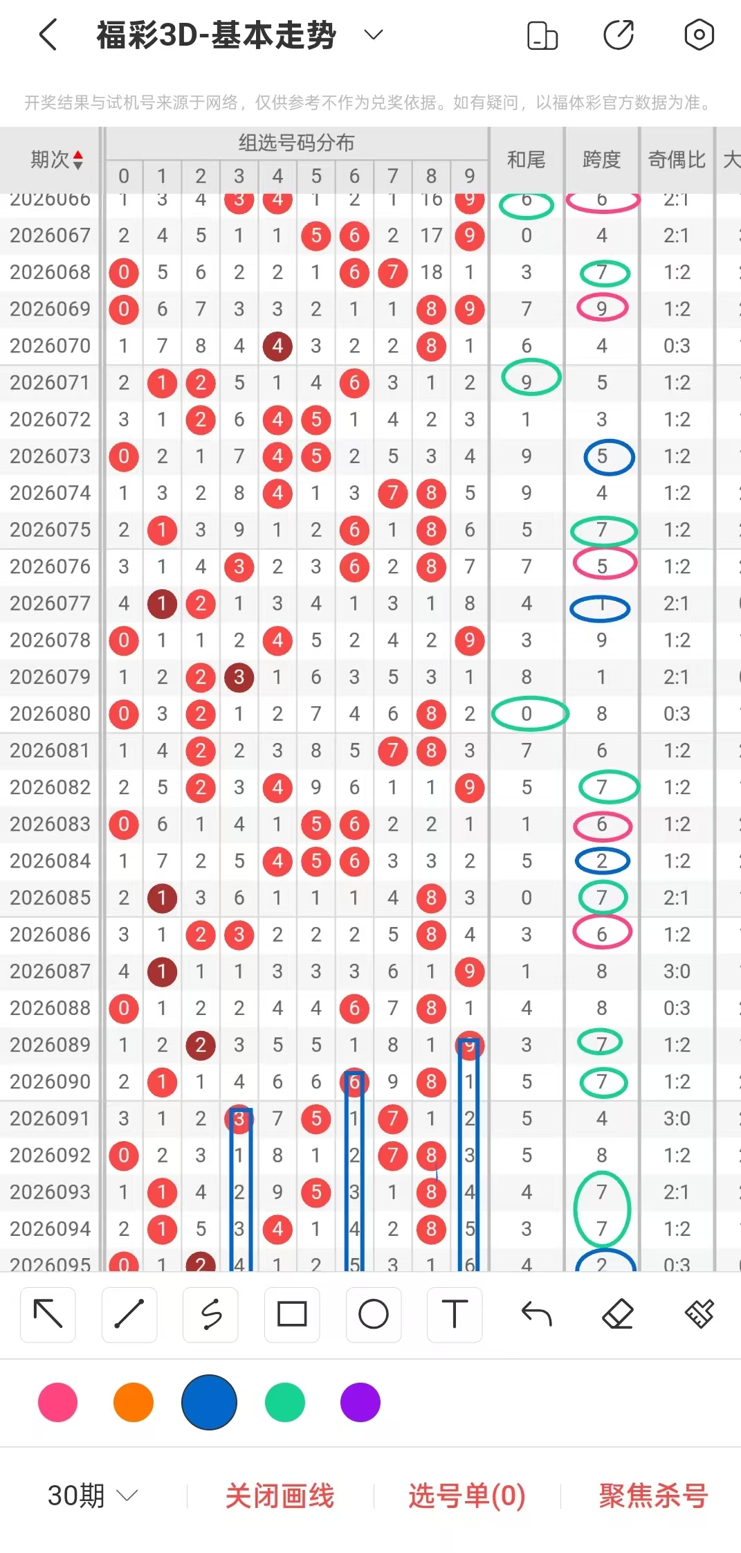 3.近30期中,跨度6和7各出现了7次(热跨),3456跨度比较温,冷8跨近期已经回补,2跨近期回补1次,所以近期需要重点关注2,6,7,8跨度。