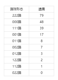 1.首先是观察222路、000路以及111路的组合,其中全二路的组合遗漏79期,000路遗漏48期,111路遗漏39期。近期需重点关注开奖号码为222路的回补。