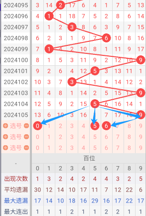 现在我给大家分析下,本期百位可能开出的号吗,上期开出了9,根据走势图我们可以看到百位,095期开出了2号码球,096期开出了1号码球,097期开出了3号码球,098期开出了6号码球,099期开出了1号码球,100期开出了9号码球,101期开出了5号码球,102期开出了3号码球,103期开出了9号码球,104期开出了5号码球,105期开出了9号码球,根据这六期的走势和历史50期内的走势对比,我们可以先考虑本期可能会出大号,下面我给大家推存百位可能开出的几个号,个人比较看好056,百位我们就先暂定这两个号。本期关注0-6之间的号码,同时关注遗漏期数较小的号码。按最近遗漏走势,开了遗漏期数较小之后开遗漏期数大的可能性比较大。