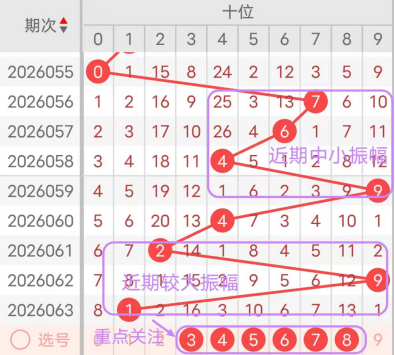 7期(057~063)开奖号十位号码球分别为6、4、9、4、2、9、1,开奖号与上一期走出的振幅分别为1、2、5、5、2、7、8。057期走出6号中大数号码球,走出“1”的小幅度,058期走出4号中小数号码球,走出“2”的小幅度059期走出9号大数号码球,走出“5”的中大幅度,060期走出4号中小数号码球,走出“5”的中大幅度,061期走出2号小数号码球,走出“2”的小幅度,062期走出9号大数号码球,走出“7”的大幅度,063期走出1号小数号码球,走出“8”的大幅度;从振幅大小及走势图的整体对应来看,中大振幅走在5~7之间较为适宜,中小振幅走在2~4之间较为适宜;结合走势图的上下对应及振幅大小分析,本期十位应重点关注号码球为3、4、5、6、7、8