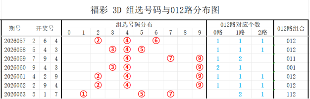 7期(057~063)开奖号与012路组合分别为264(012)、543(012)、794(011)、943(001)、429(012)、294(012)、517(112)上期开奖号为112路组合,根据整体走势分析,本期看好的012路组合有:022、002、122,001、012、112组合。
