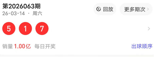 2026063期开奖号码为517,奇偶值为3奇;大小值为21小;012路走势为112路;跨度为6跨;和值13点;组六形态。