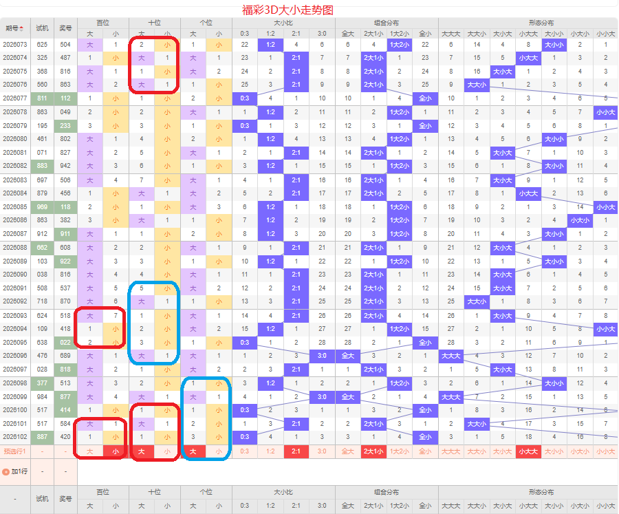 上期大小比为0:3,全小的号码组合方式,从近五期出现情况看,大号码出现6次,小号码出现9次,大小号码出现较平均,本期侧重两大的号码组合,本期百位侧重小号码,十位侧重大号码,个位要侧重看大,侧重小大大或者大大大的号码组合,根据大小做五码定位01234/56789/56789或56789/56789/56789