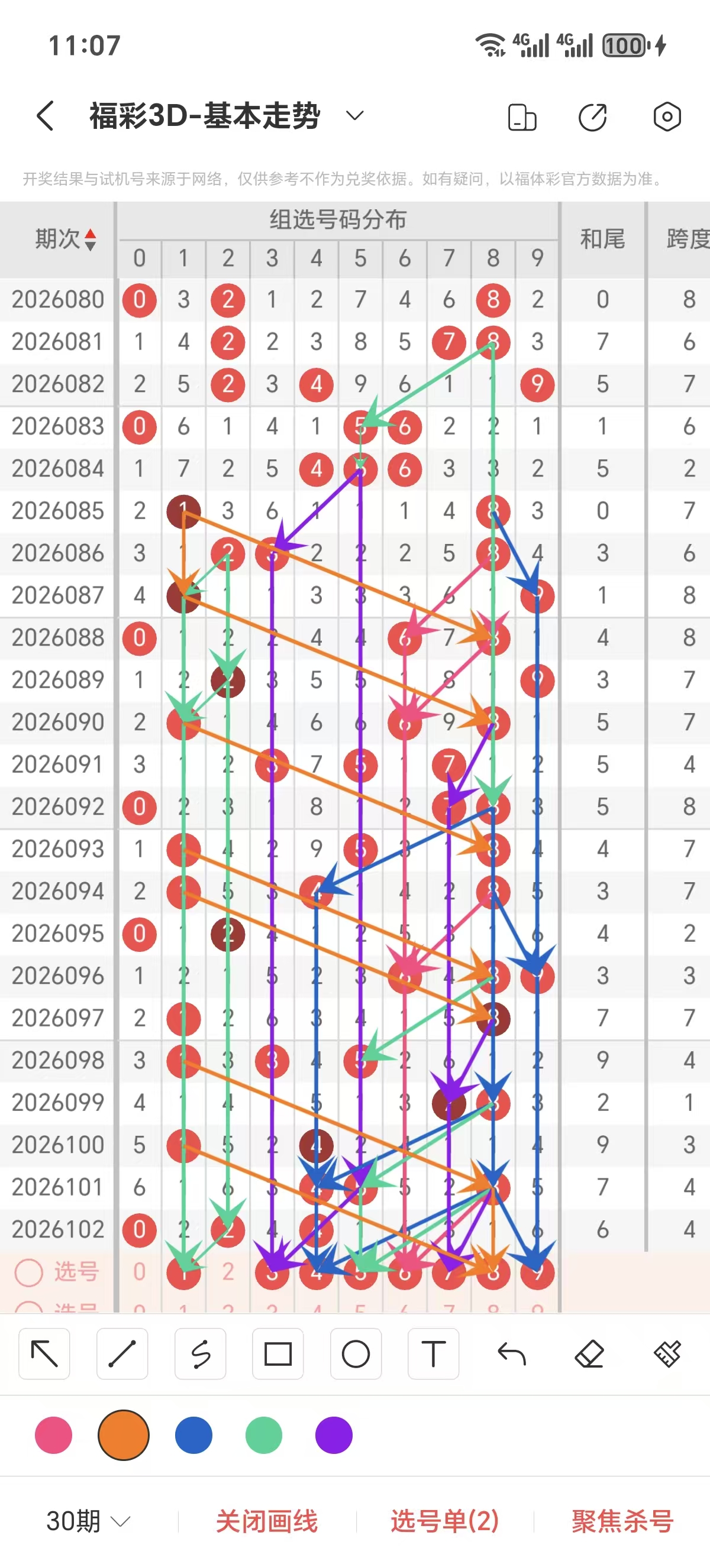 上期推荐防全路,两码差24,跨度4的条件正确,推荐双胆04组合命中。