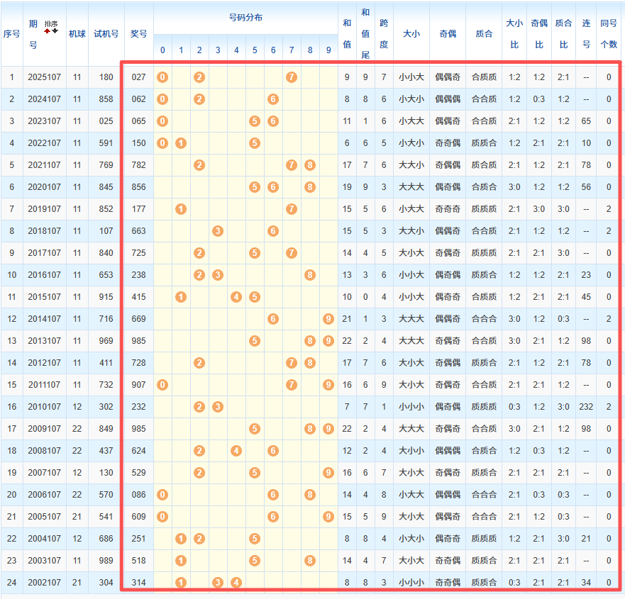 经统计0号出现7次、1号出现6次、2号出现10次、3号出现4次、4号出现3次、5号出10次、6号出现8次、7号出6次、8号出现8次、9号出现6次.统计后出现次数靠前的数字作为我们的备选号码.其号码有02568等