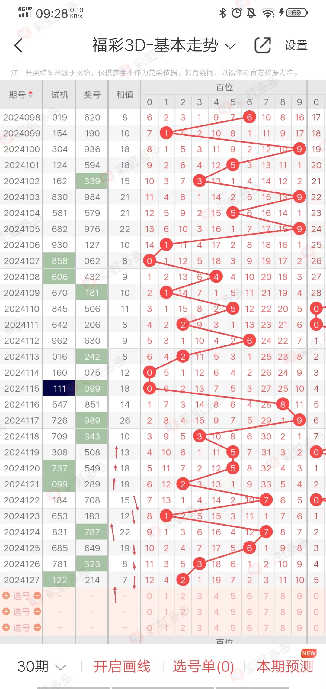 从走势图可以看出,近期幅度-13➕0➕8-5-1➕1➕5-9➕7-1-1-1➕4-2-2➕4-0-3➕6-4,上下幅度13左右,近8期多一上升两下降走势,上期下降,本期继续下降,综合和值在10-19之间